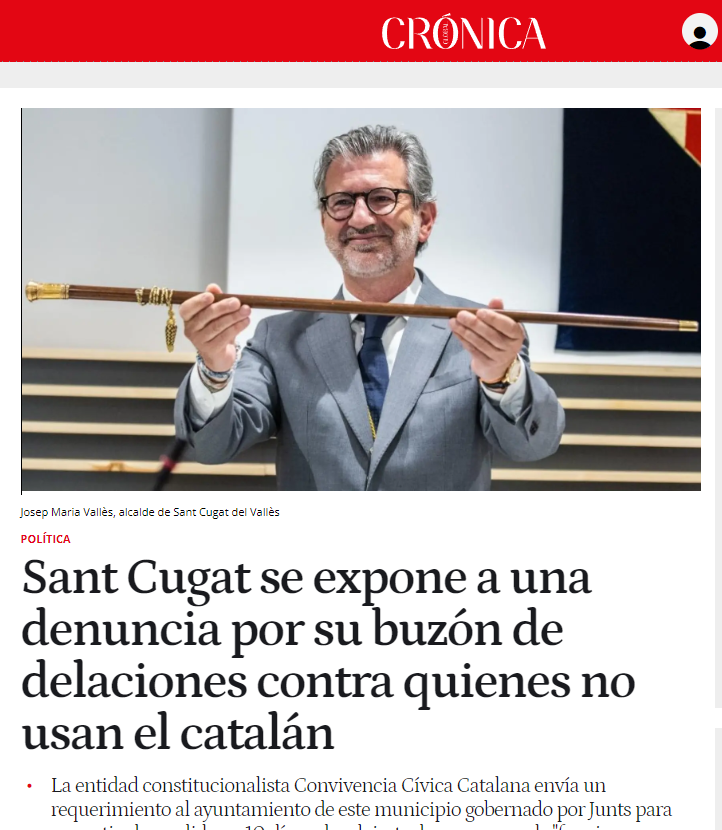 Hemos enviado un requerimiento al Ayuntamiento de Sant Cugat del Vallès para que retire el «infame» buzón que insta a los vecinos a denunciar a quien no use el catalán