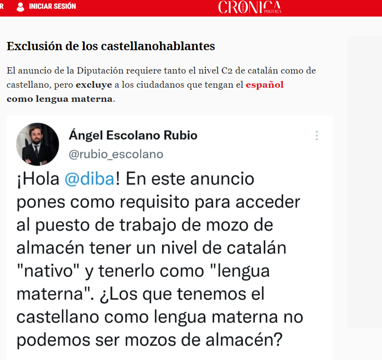 El presidente de Convivencia Cívica Catalana, ha denunciado a través de su cuenta de Twitter una oferta de trabajo del organismo en que se pide un nivel de catalán "nativo"