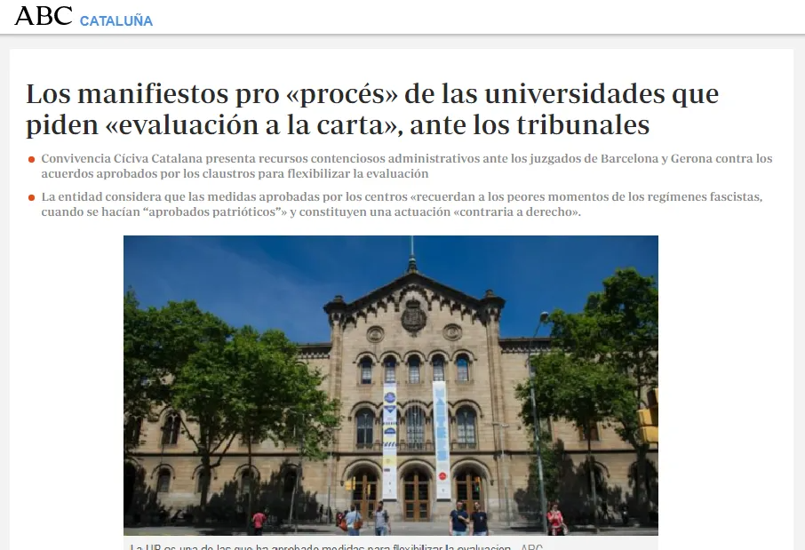 ABC: Convivencia Cívica Catalana presenta recursos contenciosos administrativos ante los juzgados de Barcelona y Gerona contra los acuerdos aprobados por los claustros para flexibilizar la evaluación
