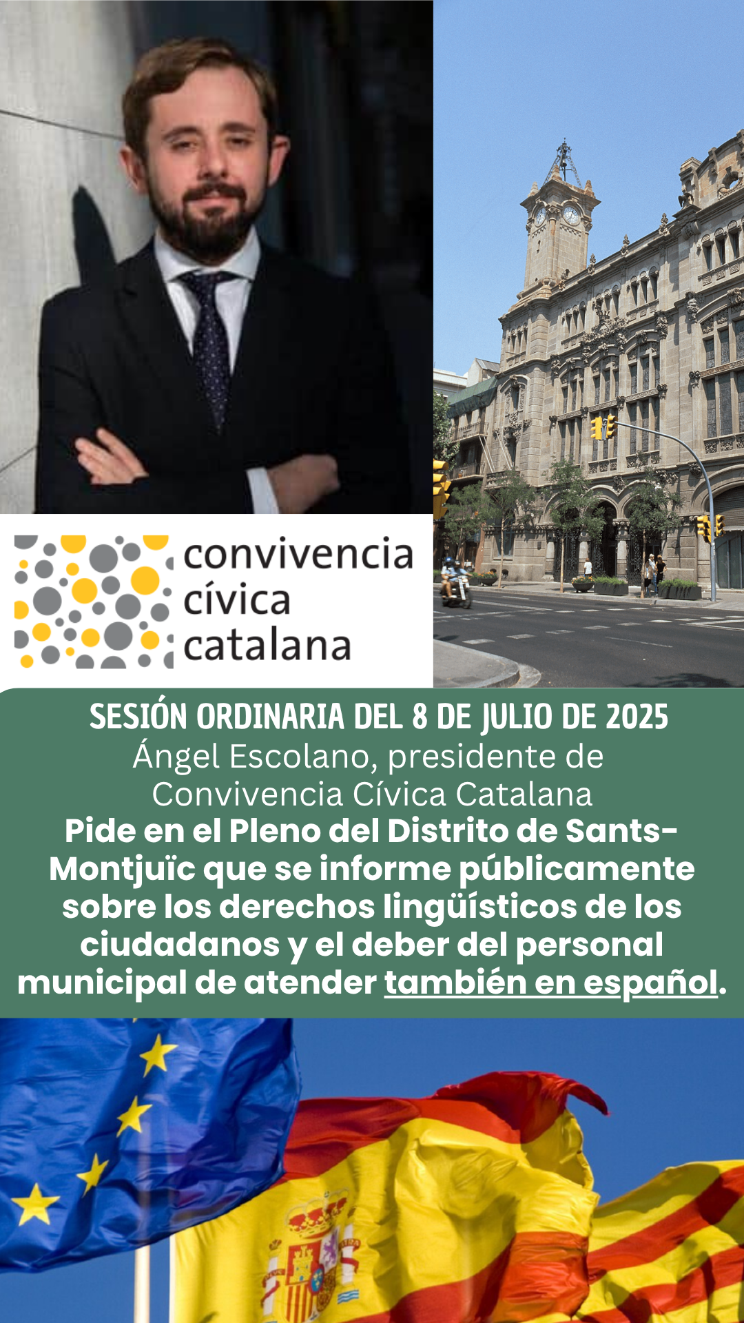 El presidente de Convivencia Cívica Catalana pide en el Pleno del Distrito de Sants-Montjuïc que se informe públicamente sobre los derechos lingüísticos de los ciudadanos y el deber del personal municipal de atender también en español.